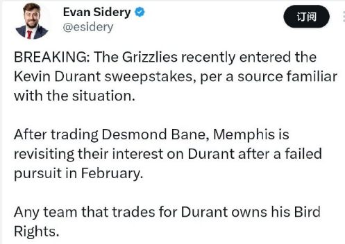 如今根据美记Evan Sidery报道,灰熊近期加入杜兰特争夺战,他们在今年2月追求失败后,如今灰熊通过交易贝恩,完成一笔1换7的大交易后,已经腾出薪资空间,也是重新对杜兰特产生兴趣。