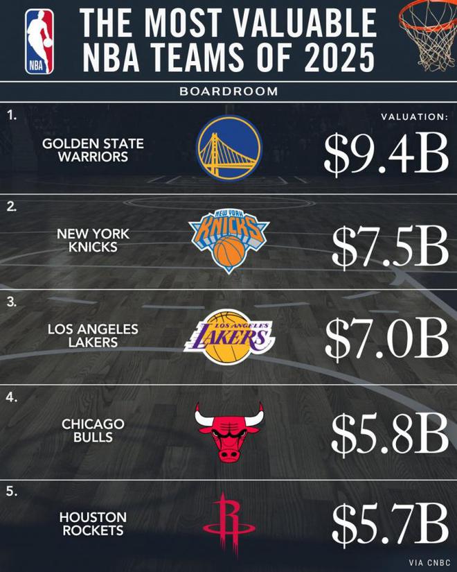 此前《福布斯》的估值估算中,湖人估值是70亿美元,而勇士是NBA第一的94亿美元。