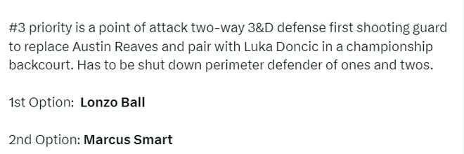 第三步就是提升后场防守能力,第一选择是公牛队的替补控卫朗佐-鲍尔,他曾在湖人搭档过詹姆斯,他只要不受伤就是顶级防守球员;第二选择是前DPOY斯玛特,这两人都是搭档东契奇最好的后场防守选择。